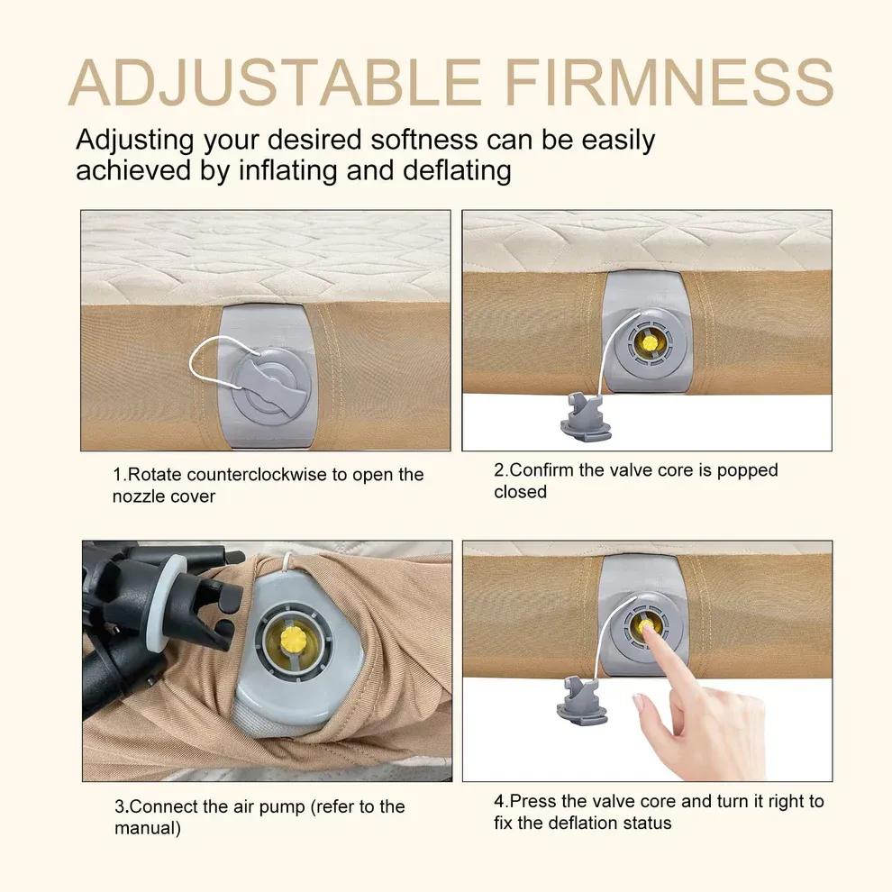 The internal airbag system is made from durable, eco-friendly PVC. You can inflate it fully for a firmer feel, or release a little air if you prefer something softer. It’s a small detail, but it makes a big difference when you’re sharing the mattress or accommodating a guest with different sleep preferences. The 2-in-1 valve handles both inflation and deflation cleanly, and the included air pump gets it ready in just a few minutes.