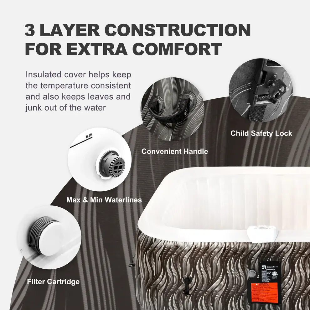 Canadian weather doesn’t always cooperate. The Relxtime outdoor LED black inflatable hot tub uses a puncture-resistant outer wall built to handle repeated inflate-deflate cycles through changing seasons. The insulated cover that comes in the box helps retain heat between sessions — so you’re not reheating from cold every time you want a soak.