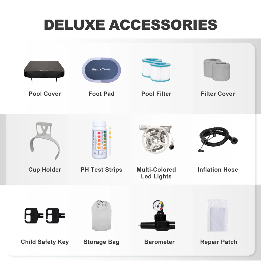 This is a plug-and-play spa in the truest sense. Inflate it with the included pump, connect your garden hose, let it heat — and you’re in. No tools, no permits, no installation crew. The complete kit includes everything you need from the first day:
