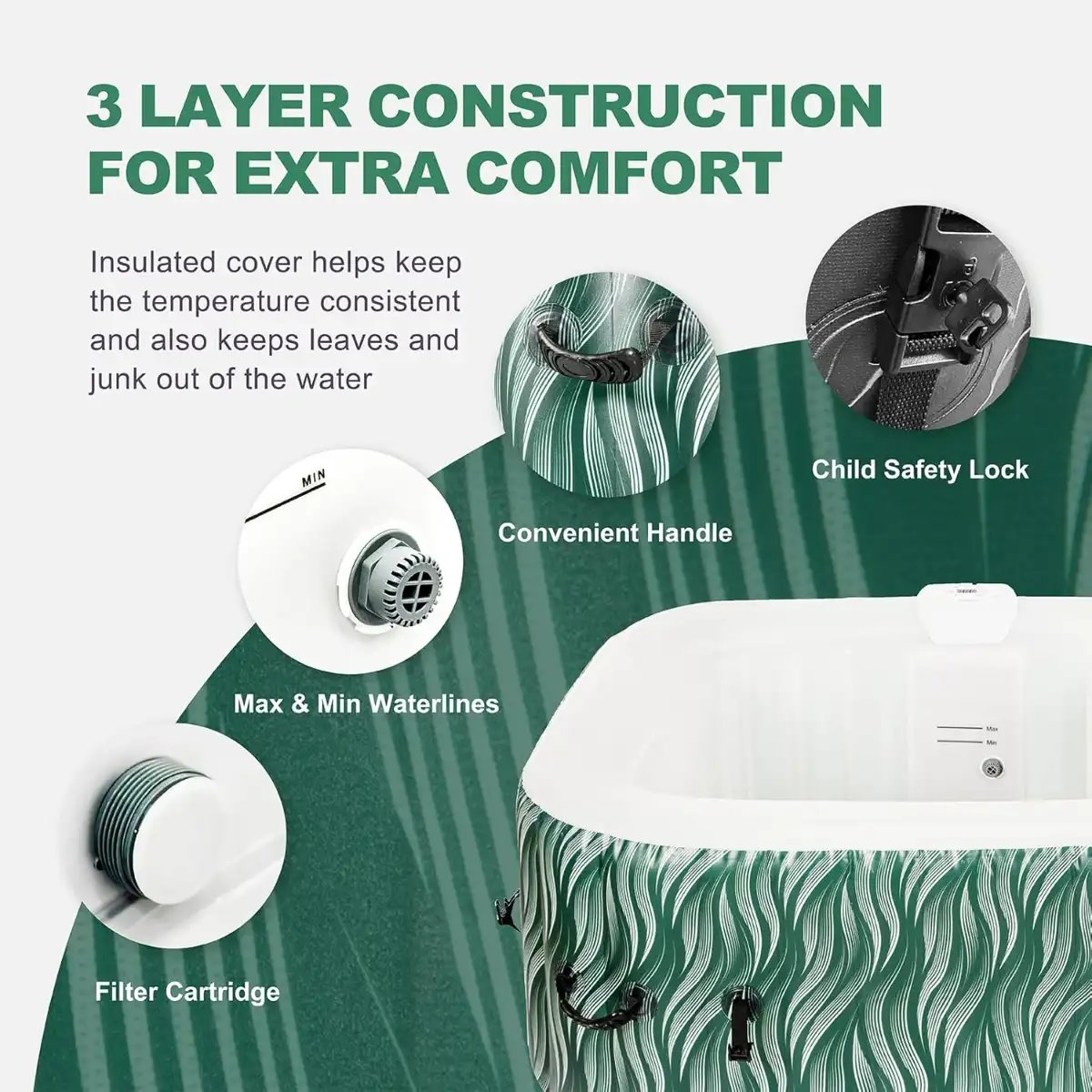 The built-in pump heats water up to 104°F (40°C) — hot enough to feel it the moment you step in. Plan around a 1–2 hour warm-up from cold tap water, and you’ll have a perfectly heated soak waiting for you by evening. The insulated cover keeps that heat locked in overnight, so you’re not starting from scratch every time.