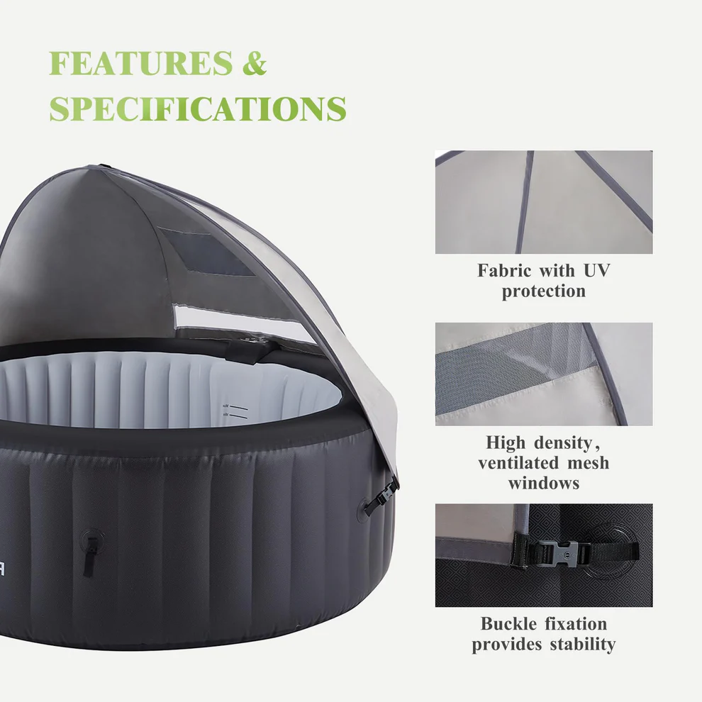 Most people pick up a canopy for the shade — and yes, it does that well. The overhead panels cut out direct sunlight so the water stays comfortable and you’re not squinting your way through a 30-minute soak. But the windproof side panels are honestly just as valuable, especially here in Canada where a nice evening can turn breezy fast. The sides break that wind before it reaches the water, which means the warmth stays where it belongs — around you.