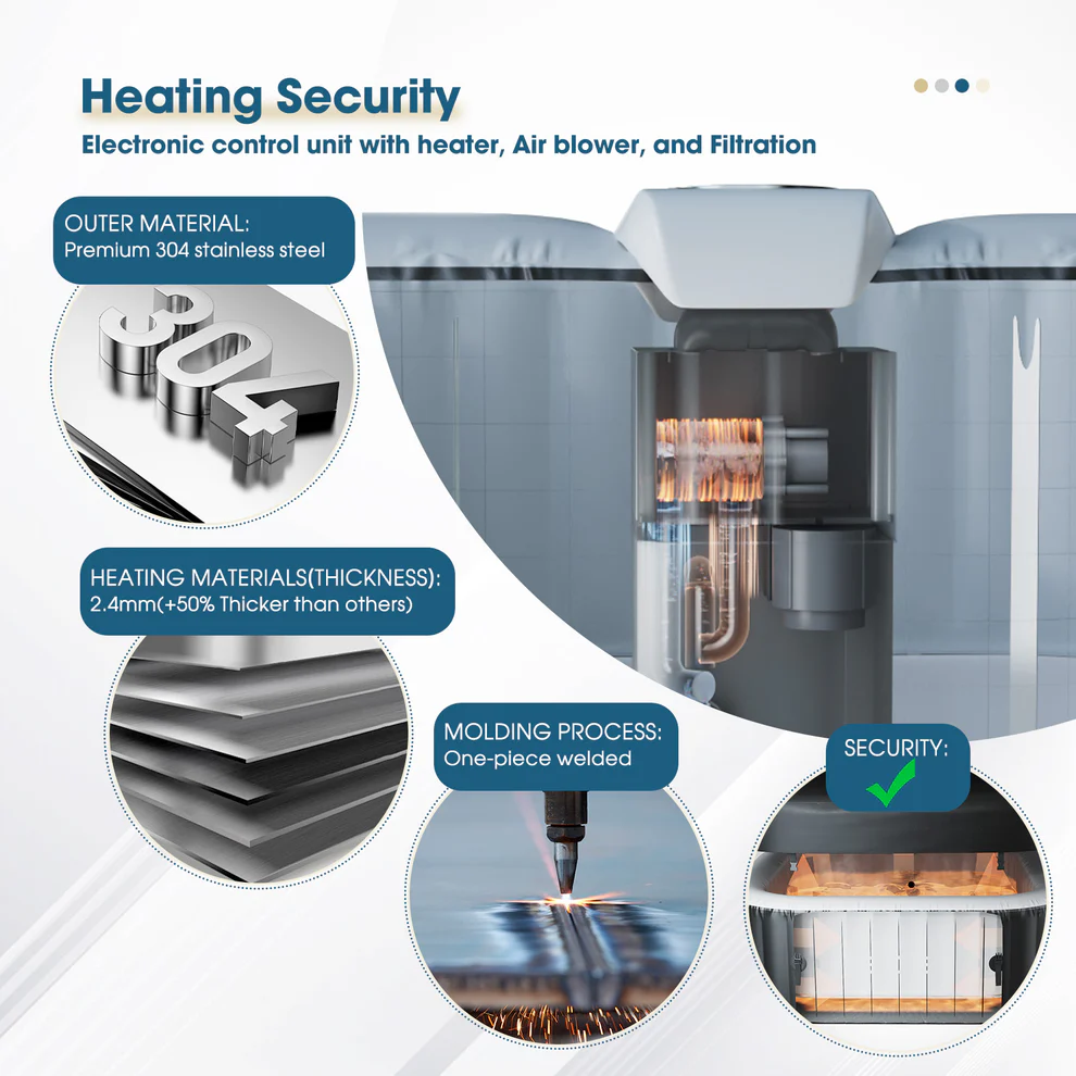 This portable hot tub runs 110 high-powered bubble jets around the base and walls of the tub. They push warm air through the water from every direction, wrapping you in that soft, all-around massage effect that loosens tight muscles and melts the stress out of a hard week. It’s gentle rather than pinpoint pressure — great for full-body relaxation, soaking sore legs, or just switching off for 30 minutes. If you’re after deep-tissue directional pressure, that’s a different style of spa entirely; but for everyday decompression, these jets deliver exactly what most people are looking for.