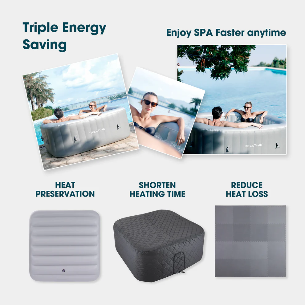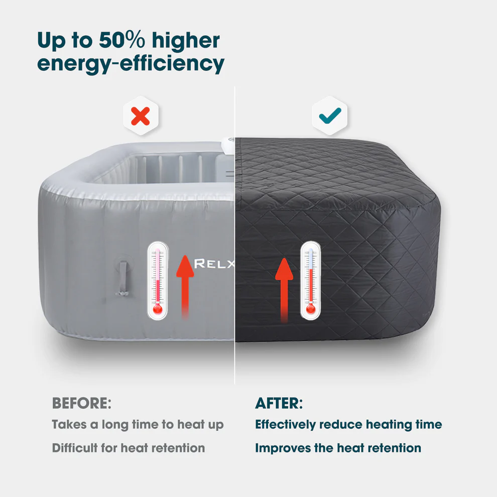 Canadian winters are tough on inflatable hot tubs. Without proper insulation, your tub’s heater works overtime — running longer to compensate for heat escaping through a thin or worn-out cover. The RELXTIME square inflatable hot tub insulation cover uses a high-quality insulated inner coating combined with a waterproof outer fabric layer to hold temperature between uses. You come home from work, and the water is still warm. That’s the difference a proper thermal cover makes.